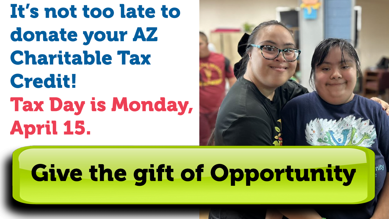 It’s not too late to donate your AZ Charitable Tax Credit! Next Monday, April 15 is Tax Day, the final day to file your state taxes. Drive the power of your taxes for Opportunity this year by donating your Arizona State Charitable Tax Credit to support the best in programming for our Members. Individuals can give up to $421, and couples filing jointly can give $842, and get a dollar-for-dollar credit off of their state taxes! Talk to a tax professional to determine the full implications of your donation.